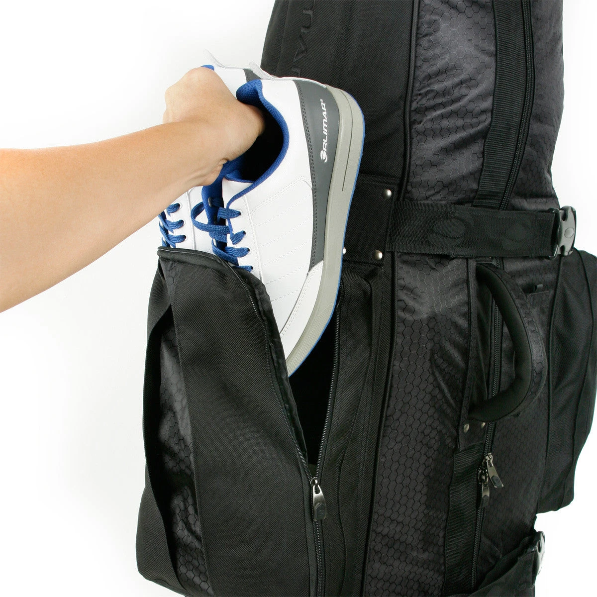Orlimar 9.0 Premium Golf Travel Cover with Wheels feature durable 600 denier material, molded chassis with corner skate-style wheels for a smooth roll, riveted four-point lift handle, bumpers, heavy-duty large-tooth zippers, large external shoe pocket, padded club-protection top and identification holder.